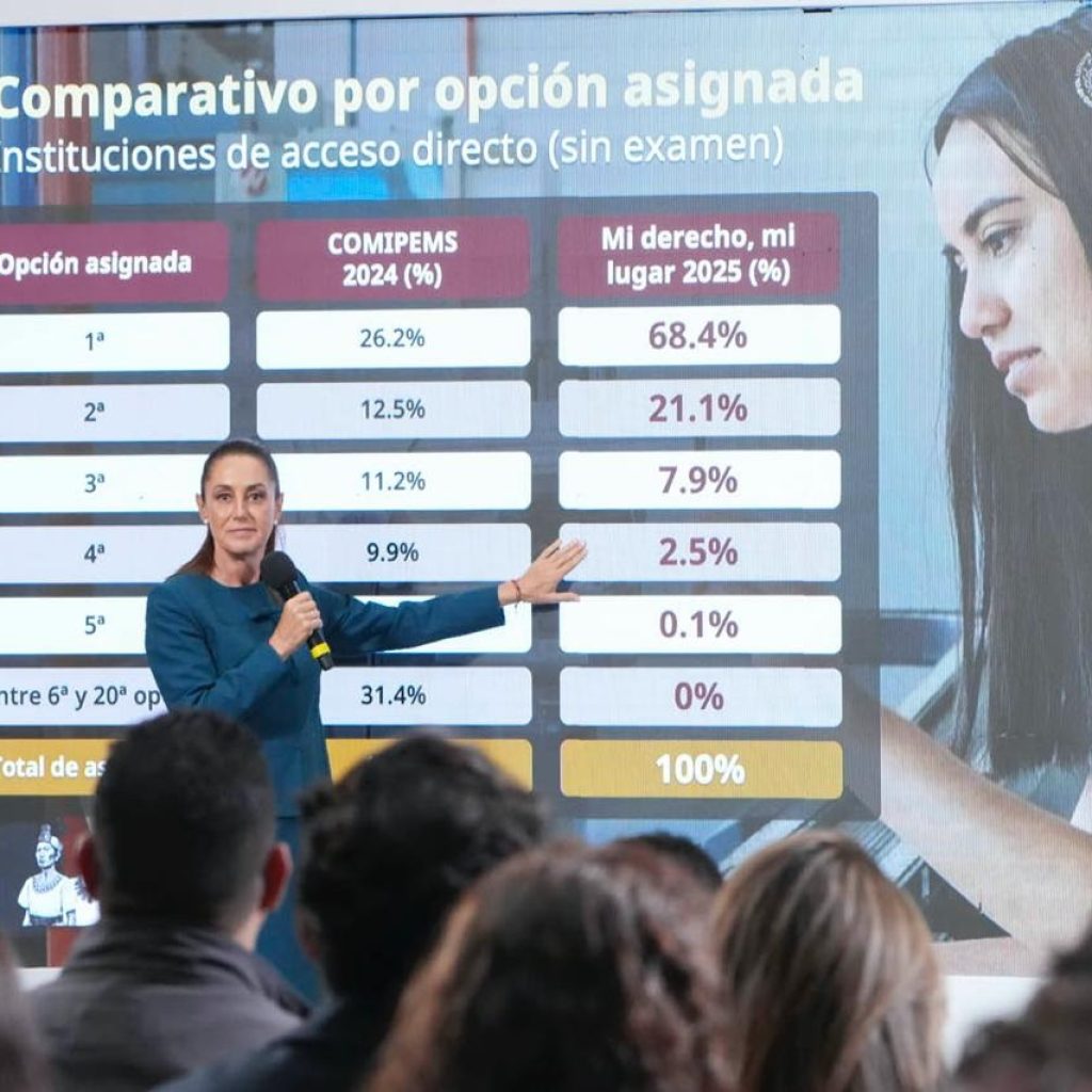 Ciudad de México, 26 de agosto de 2025. La presidenta de México, Claudia Sheinbaum Pardo, anunció que tras la desaparición del examen Comipems para ingresar a preparatorias y bachilleratos en la Zona Metropolitana del Valle de México, hoy todos los jóvenes cuentan con un espacio para estudiar en planteles de su elección.