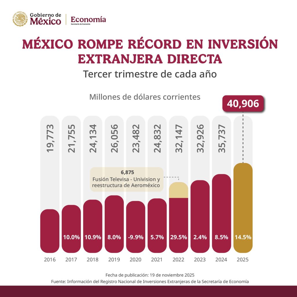 Ciudad de México 19 de noviembre de 2025.- México ha alcanzado un nuevo máximo en la Inversión Extranjera Directa (IED), al situarse cerca de los 41 mil millones de dólares al tercer trimestre de 2025, de acuerdo con los datos presentados por la Secretaría de Economía.